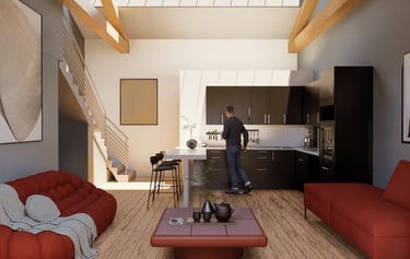 Tout comme le Loft A ce projet s'inscrit dans la réhabilitation d'une usine des années 1930. Nous souhaitons ici réaliser la réhabilitation de la charpente bois d’origine, préservant ainsi l'identité historique du lieu. La toiture est entièrement refaite à neuf pour accueillir une isolation haute performance et des panneaux solaires, ainsi qu'une verrière en triple épaisseur sur la partie centrale de la toiture, permettant de réduire durablement les dépenses énergétiques du loft, et d'amener de la lumière dans le logement.